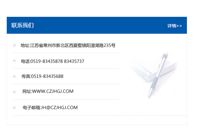 地址:常州市新北區友邦商務大廈1幢16、17層  電話:0519-85101652  傳真:0519-85112595  郵編:213022  網址:www.cz-jiayue_cn.fsjindelai.com  郵箱:xiajifengaa@163.com